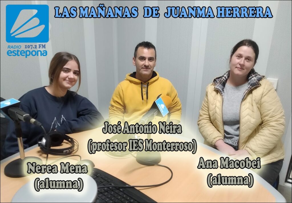 José Antonio Neira, profesor del IES Monterroso, junto con 2 alumnas que disfrutarán de movilidades Erasmus+ en próximo mes de mayo, hablan de su proyecto dentro de la Formación Profesional. Pincha en la foto y escucha la entrevista realizada por Juanma Herrera en Radio Estepona, para conocer la experiencia con detalle.